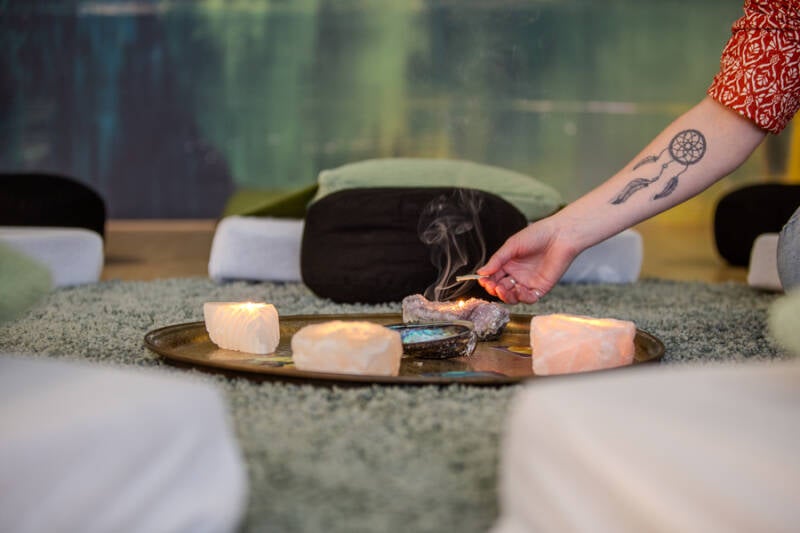 Het zachte licht van kaarsen en lampjes omhult de ruimte in een warme gloed. De geur van salie, de zachte matjes onder je lichaam en de aanwezigheid van edelstenen, wierook en muziek nodigen uit tot vertragen, voelen en een reis naar binnen.